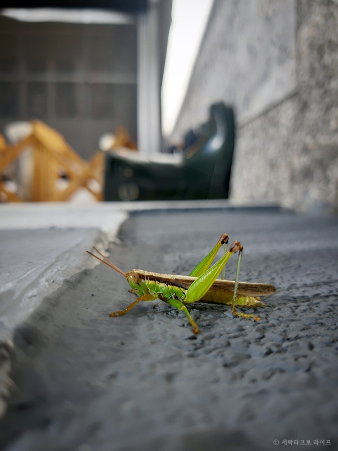 장마가 끝난 후 무더위 속에 햇살을 피하기 위해 메뚜기가 벽면에 붙어 있는 모습을 보고 녀석의 능력에 놀라게 된다. 도심에서 메뚜기를 보게 될 줄이야, 귀한 손님으로 생각하고 조만간 손님 또는 소식이 찾아올 것 같은 예감이 든다. 중력을 거스르는 메뚜기의 능력을 담은 사진을 수평이 아닌 수직으로 보는 시각이 보았을 때 흥미로워졌다.