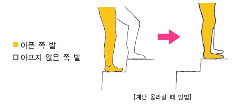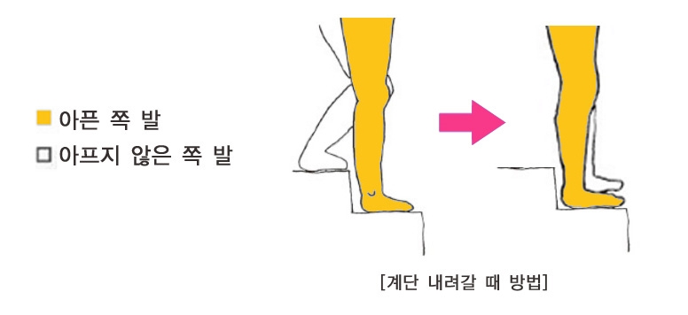이 과정을 반복하면 됩니다. 반대 상황인 계단을 내려갈 경우에는 평지에서 출발할 때처럼 먼저 아픈 쪽 무릎을 편 상태에서 아래쪽 계단에 내려놓고, 아프지 않은 쪽 다리를 계단에 내려서 두발을 나란히 같이 모읍니다(아래 그림). 이 경우 상체 역시 앞으로 숙이지 않도록 유의하면서 이 과정을 반복하면 됩니다. 이렇게 일상생활에서 올바른 반복적인 보행 연습과 약간의 습관 변화만으로 통증도 해결하고 외관상으로 절뚝거리지 않고 보기 좋게 걸어 다닐 수 있습니다.