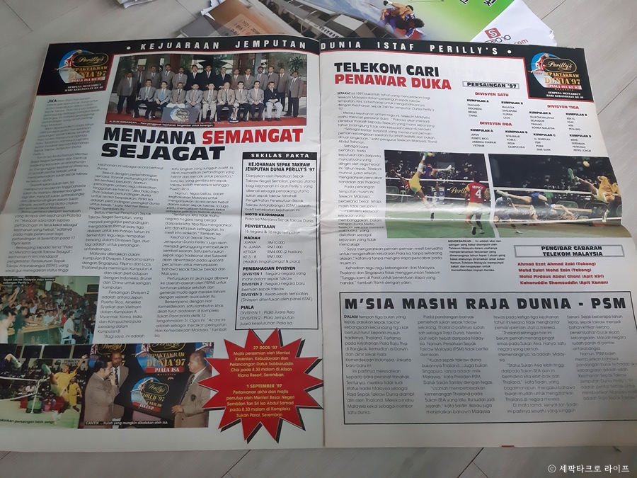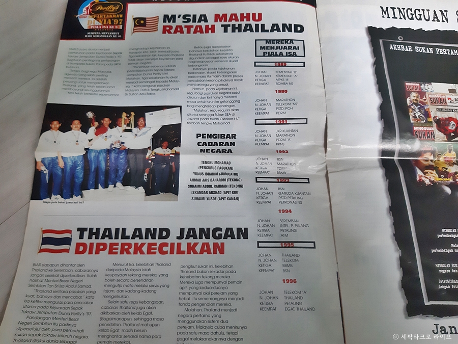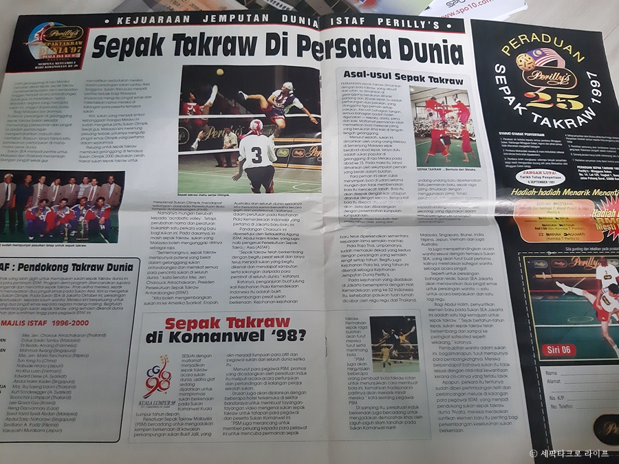 30년이 넘은 세팍타크로 매거진을 꺼내보면서 말레이시아 중흥 시절이었던 세팍타크로를 떠올려 본다. 1998년 방콕 아시안게임을 기점으로 말레이시아 세팍타크로는 침체기에 들어가 정체기를 맞이하고 최근에 다시 부흥을 위해 서서서 인기 몰이를 하고 있는 중이다. 하지만 과거 명성에 맞는 경기 기량은 현저하게 떨어지게 되었다는 사실은 부인할 수 없다.