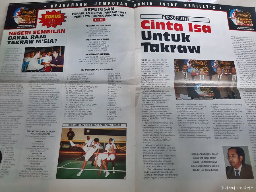 말레이시아 주간 스포츠(MINGGUN SUKAN) 잡지는 칼라풀한 종이에 화려한 세팍타크로 기사가 10페이지정도 가득 차 있는 모습에 세팍타크로 관심도가 얼마나 높은지 짐작할 수 있었다. 오늘 세팍타크로 경기한 내용이 다음날 조간 혹은 석간 신문에 세팍타크로 기사가 나온다는 것이 얼마나 신기한 일인지 놀랐다.