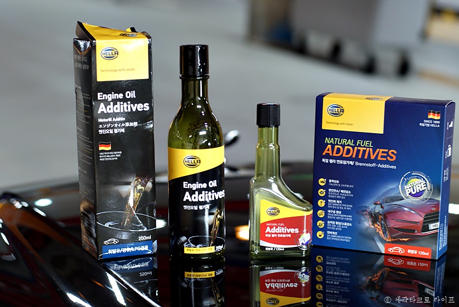 헬라 엔진오일첨가제(왼쪽), 헬라 연료첨가제 며칠 후 연료 60리터에 120ml 제품 한 병을 넣는 방식으로 헬라 연료첨가제 한 병을 넣었다. 헬라 연료 첨가제는 엔진 성능 개선, 엔진 속 카본 때 제거, 내구성 향상, 완전연소/매연 감소, 승차감 향상/소음 감소, 순수 윤활제 성분 연비 향상의 효과를 준다고 나와 있다. 넣고 나서 엑셀을 밝았을 때의 느낌은 역시 달랐다. 최근 박병일명장 유튜브에서 엔진오일 첨가제 실험을 한 결과 효과 있다는 것을 확인하였다. 자동차를 좀 더 아끼고 오래 타는데 연료 첨가제는 도움이 되는 것이 입증되었다.