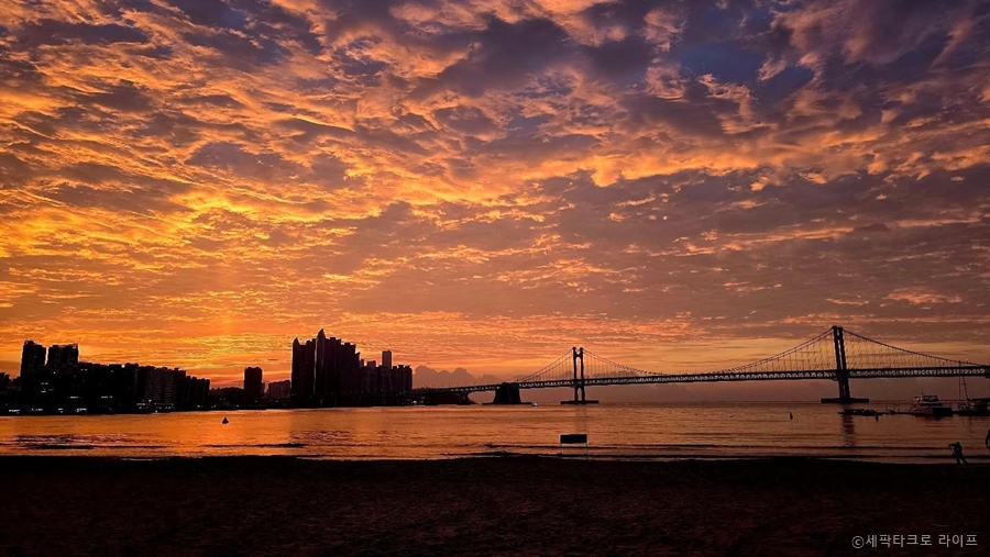 2025년 7월 16일 아침 6시16분 부산 광안리해수욕장에서 광안대교와 마린시티 건물 배경으로 펼쳐진 아침 붉은 노을은 보는 이로 하여금 탄성이 저절로 터져 나오게 했다. 이날 이전에 부산은 주말마다 비가 쏟아져 내렸고 구름이 잔뜩 하늘을 덮혀 있었는데 직감적으로 아침 노을은 장관이 될 것 같은 느낌이 들어 운전대를 광안리 방향으로 잡았다.