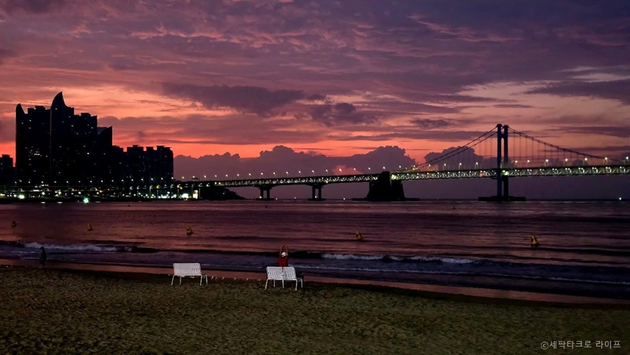 광안리 해변 의자에서 둘 팔 벌려 기지개를 펴면서 아침 해를 맞이하는 모습 시간이 흐르면서 하늘에 붉은 융단이 펼쳐지듯 온 도시가 붉은 기운으로 감도는 듯 한 동화 속 분위기가 연출되었다. 솔직히 아침 노을이 주는 신비로움이 이정도일 줄 믿기 어려울 정도였다.