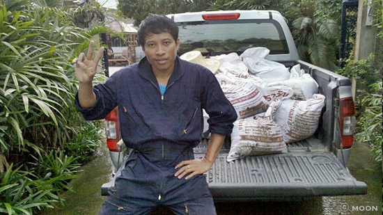 ▲ 태국 친구 동네 수판부리. 물에 잠겨 버려 보트를 타고 이동하는 모습과 뚝을 쌓고 있는 친구의 모습.