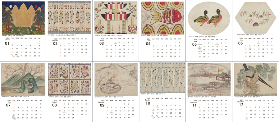 2022년 새해에는 검은 호랑이 해를 맞이하여 호랑이를 그리는 수업을 하고 있는 것 같았다. 가까이 있으면 금정아트 민화공방에서 매 달 그림을 그려 집에 걸어두고 싶은 심정이다. 그건 그렇고 2022년 새해 달력 이미지는 아래와 같이 12개월 이미지가 한국적인 정서에 맞는 그림으로 그려져 있어 달력으로 근사하다.
