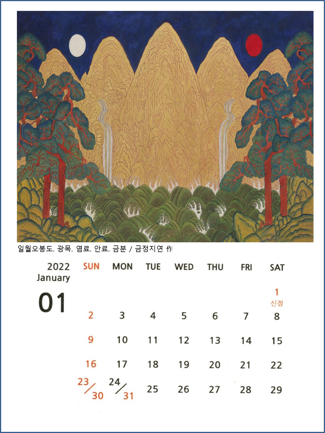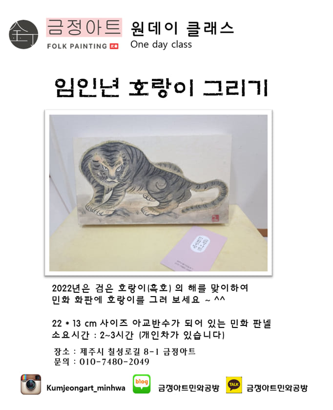 2022년 새해가 밝았다. 제주도에서 금정아트를 운영하는 사장님이 직접 만든 달력 이미지를 주셨다. 금정아트는 한국의 정서를 담은 민화를 그릴 수 있는 공방으로 자신만의 그림을 멋지게 그릴 수 있게 만들어주는 곳이다. 점차 사라져가는 민화를 배울 수 있고 직접 작품을 만들어 집에 소장할 수 있어 좋은 경험이 될 수 있는 금정아트 공방은 언제든 열려 있다.